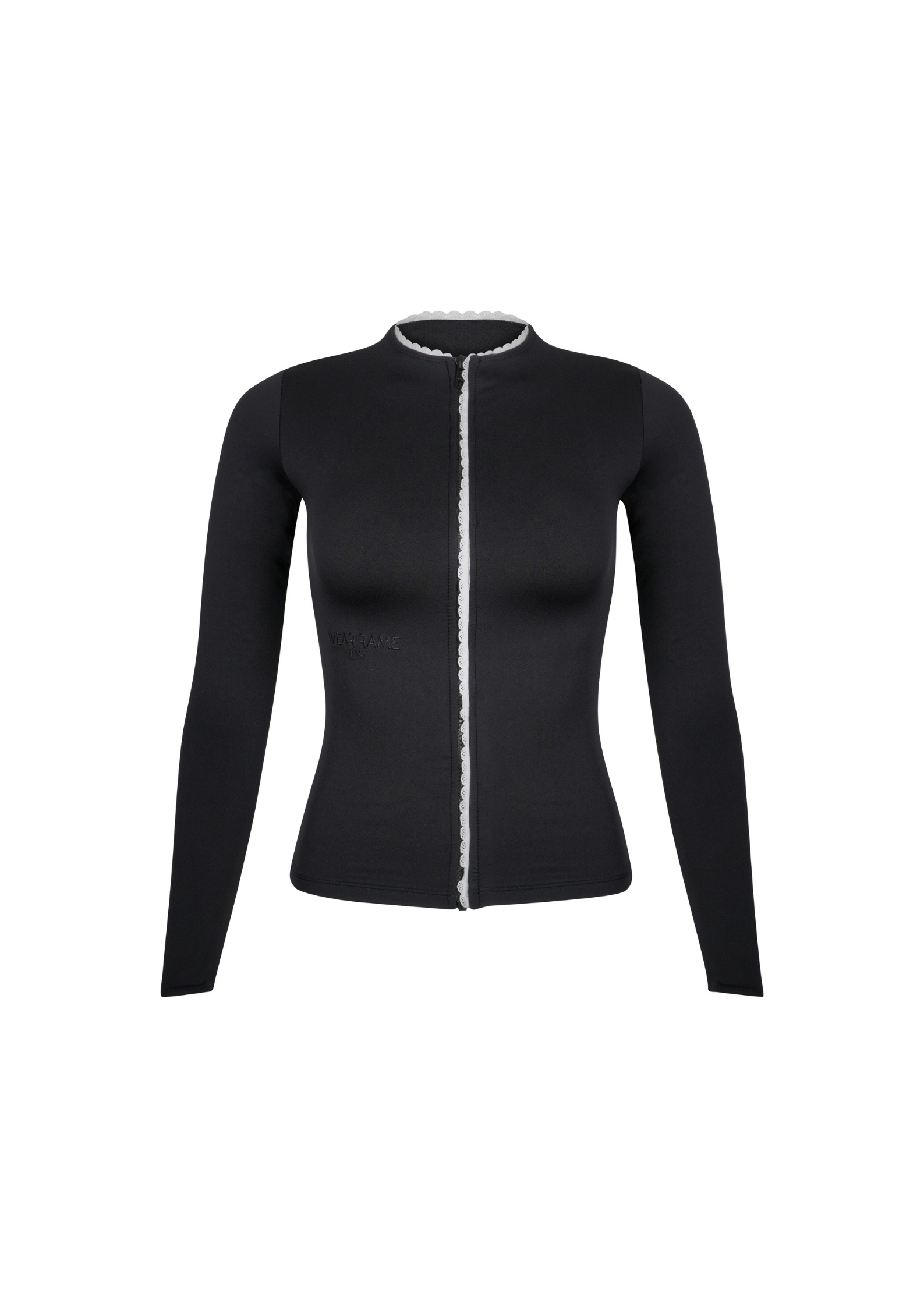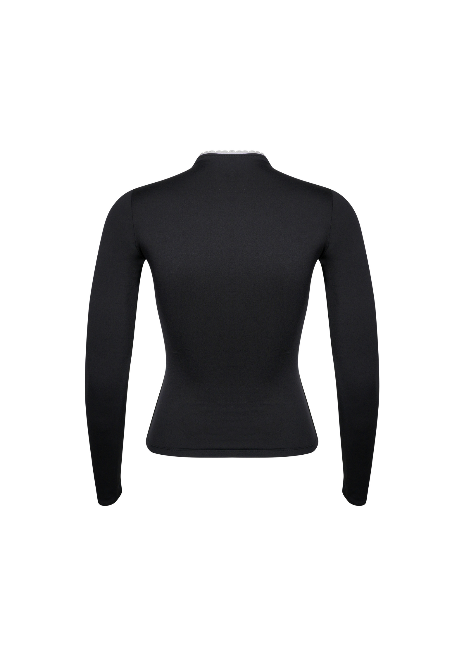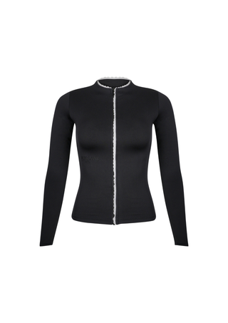 Subtle lace trim runs along the front opening and edges, adding a delicate feminine contrast to the full black base, modern, understated, and versatile.